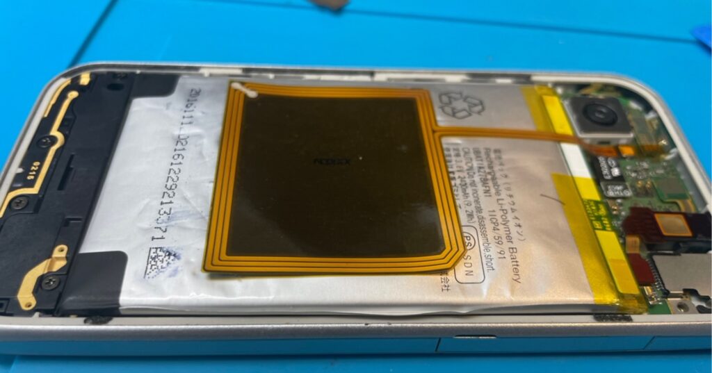 分解してみるとバッテリー部分にシワが。膨張が起きている状態です。
