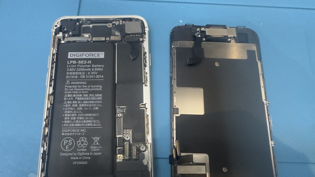 次にバッテリーを取り除き、新しい電池を組み込み逆の手順で組み上げていき動作テスト後最後に背面を圧着し修理完了となります。